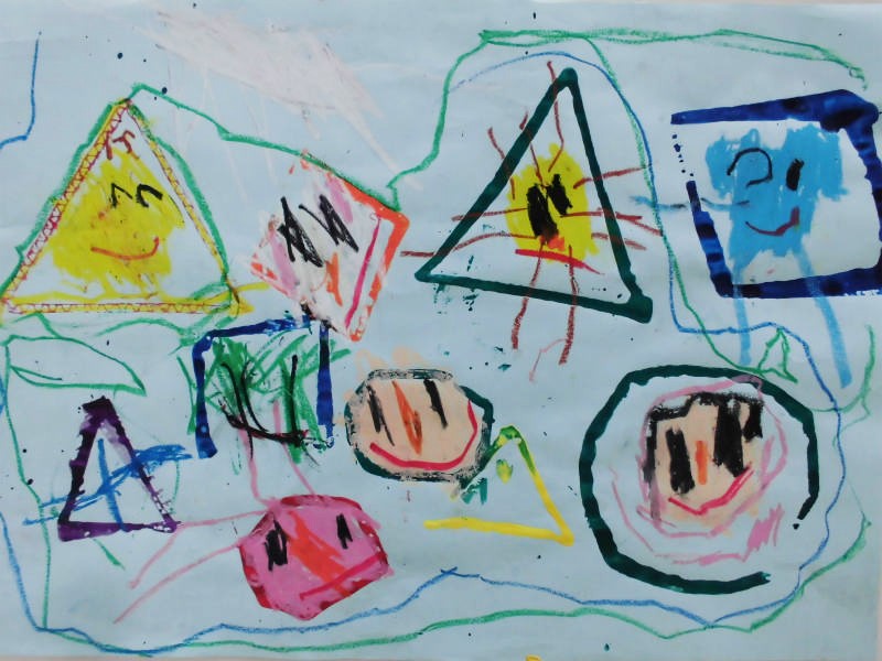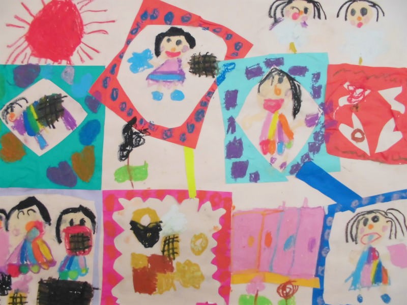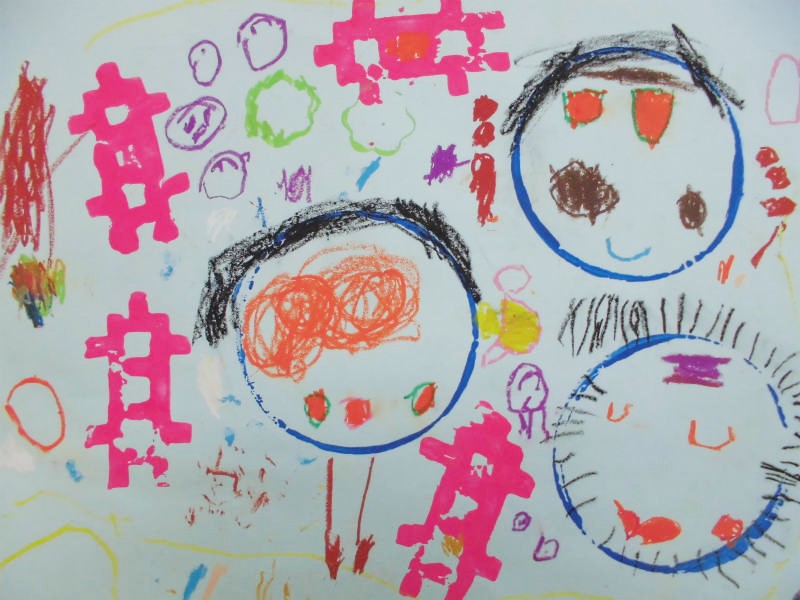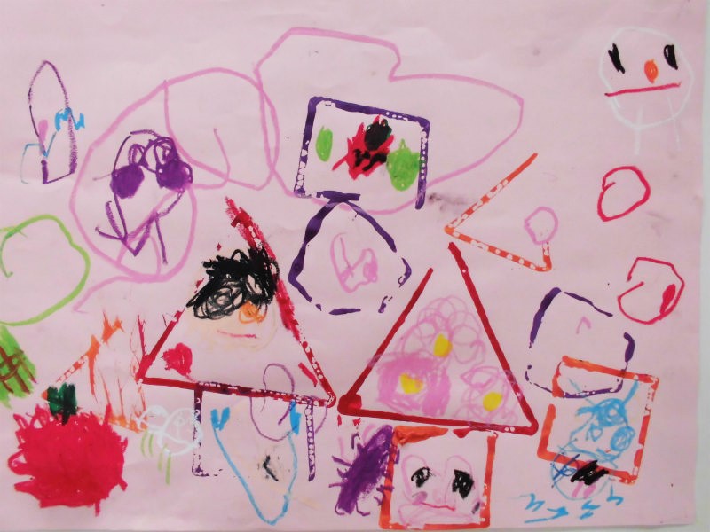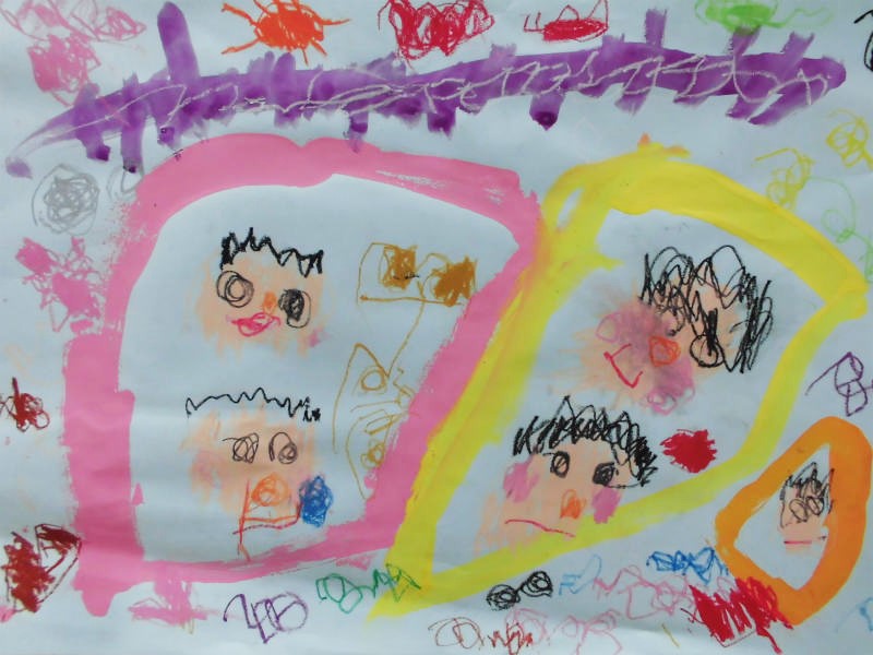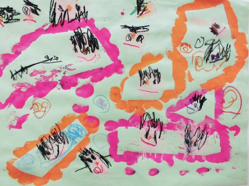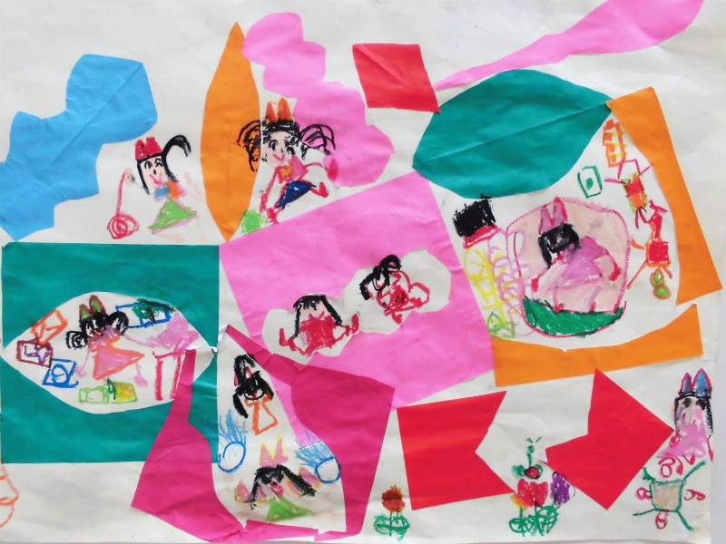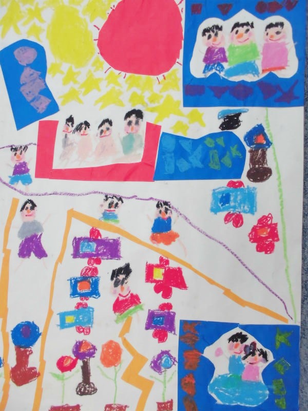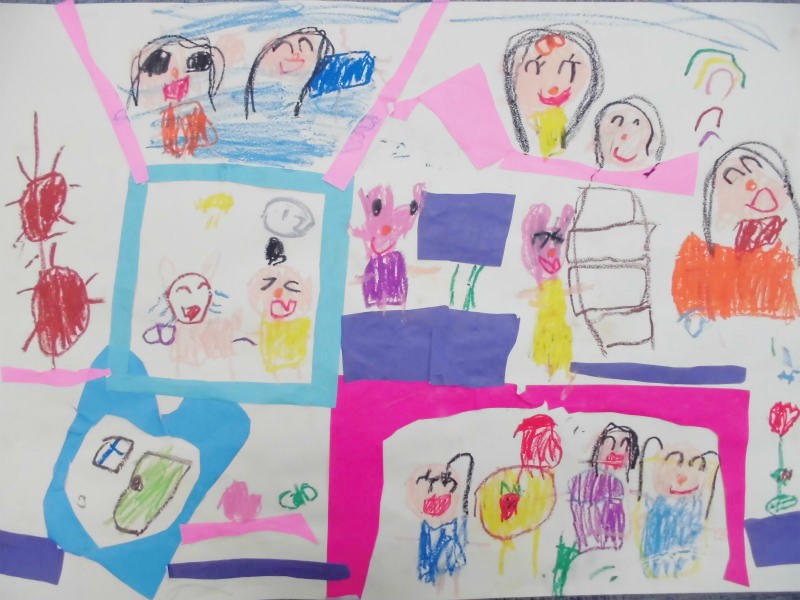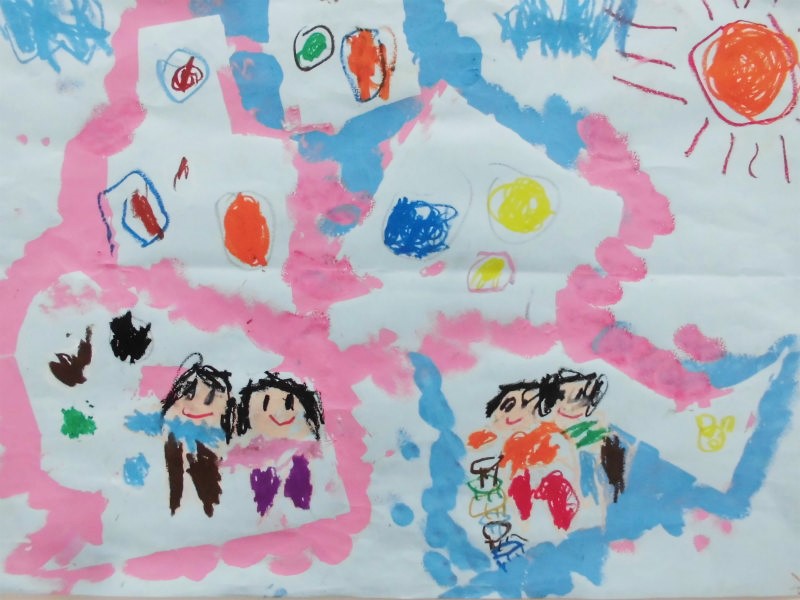 『いろんな街』ピンクは私とママのおうち。ロボットがいてる。黄色はパパとにーにのおうち。お外にいっぱいお花が咲いてる。