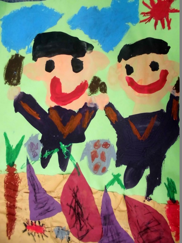 『お友達とお芋を掘って、掘れたから「やったー!」って、上にあげてる。』